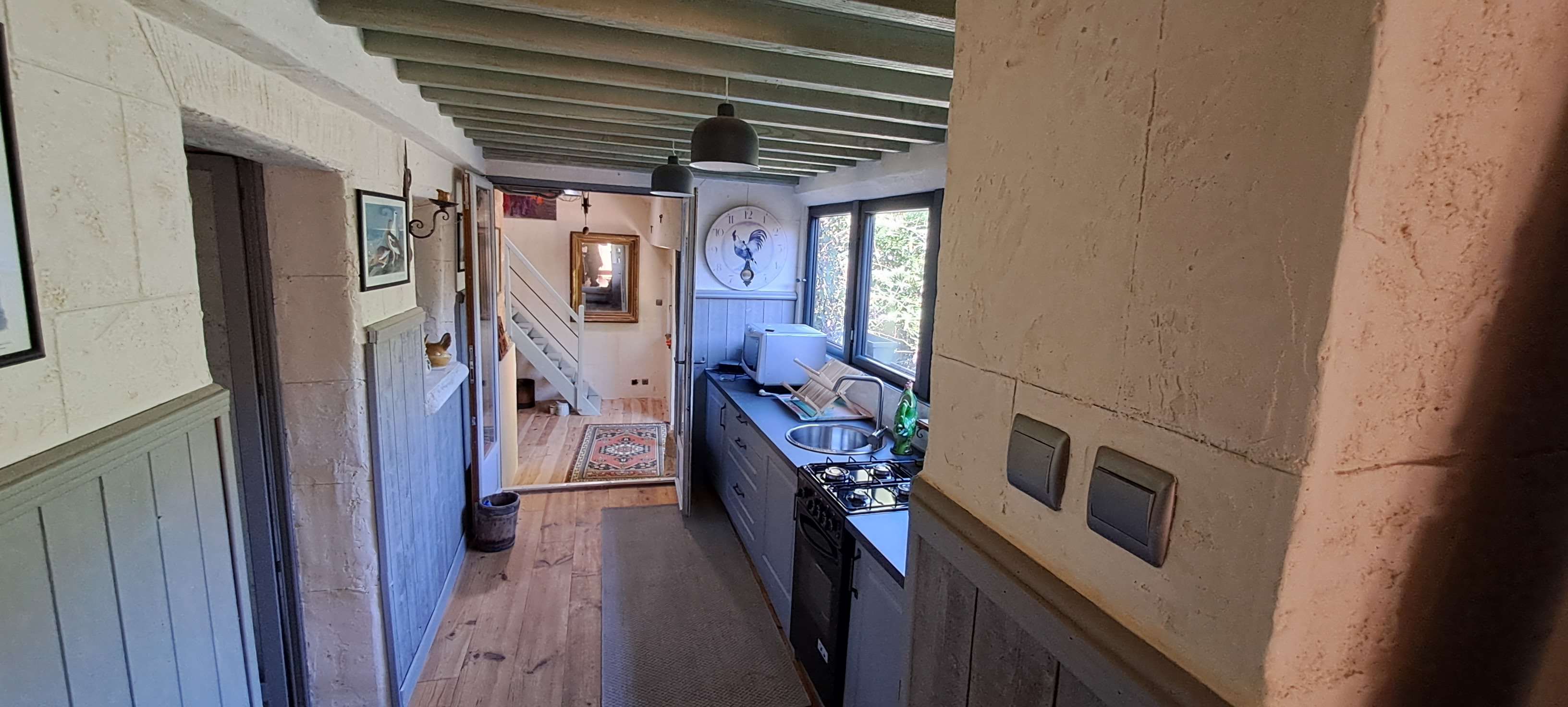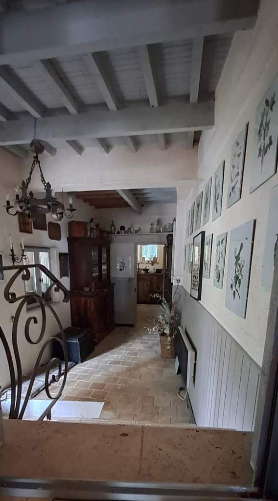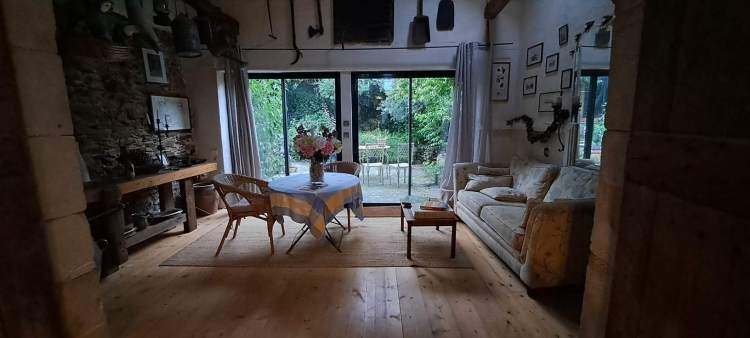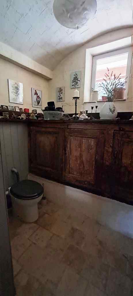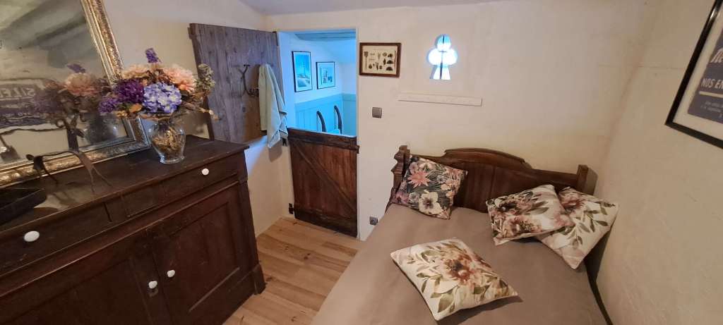 Finally, back in the kitchen, you can access the original house, which features a living room with the old scullery, a shower room, and a charming romantic bedroom on the upper level.