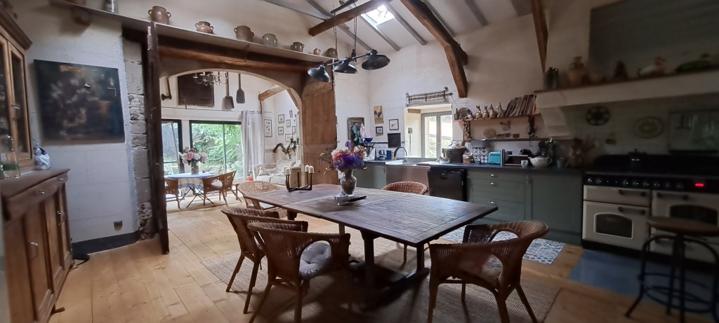 Si l’on monte les escaliers, on accède à la grange rénovée où il y a la cuisine, la salle à manger, le salon et enfin le salon d’été.