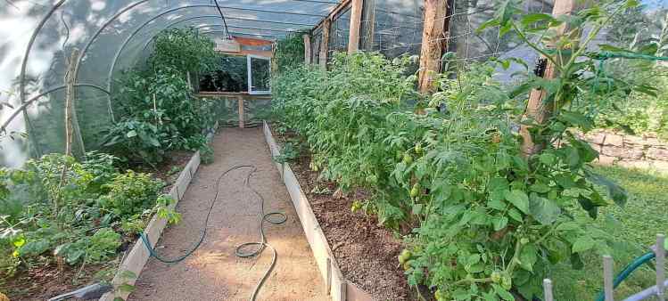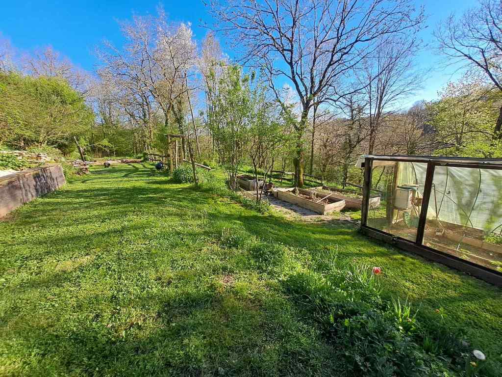 The garden becomes adorned with brilliant flowers as the quince and plum trees begin to ripen. Hay can be harvested and stored in the shed, a space under the terrace. Or, with planning permission another barn can be erected. In the greenhouse, tomatoes and all manner of other vegetables and herbs grow and ripen in raised beds in this organic garden.