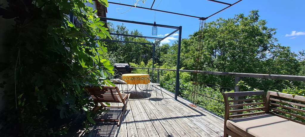 The former barn has been transformed into a vast open living space with an enormous kitchen, sitting room and dining room, a summer salon with French doors out to the courtyard, a restroom/laundry room, entryway, bathroom and a wisteria-draped deck. The mezzanine master bedroom (ensuite) overlooks the living area from one side and looks out over the forest treetops from the other.