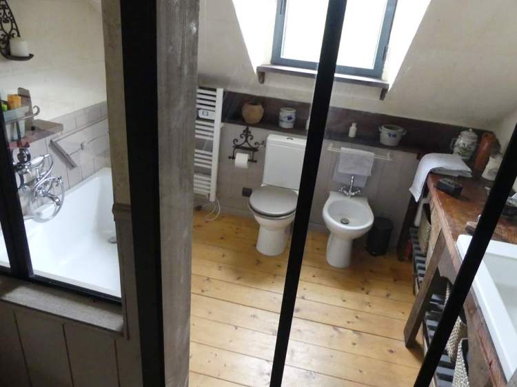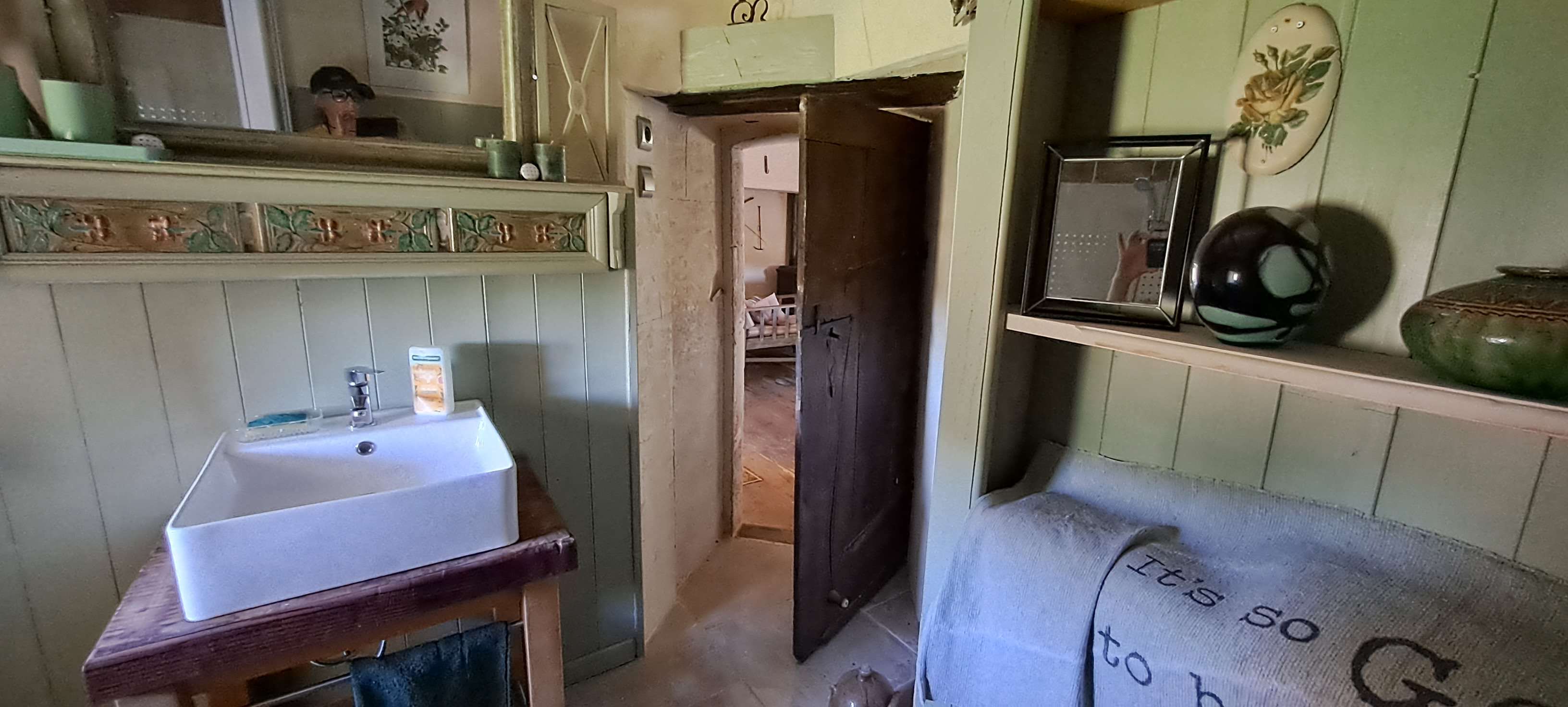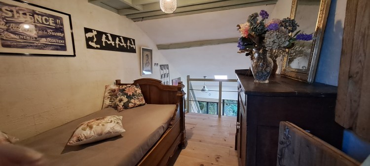 Finalement, de retour à la cuisine, on accède à la maison originelle : un salon, avec l’ancienne souillarde, une salle d’eau et enfin une chambre romantique à l’étage.