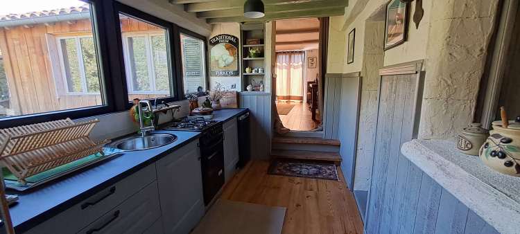 Sur la gauche, une jolie petite cuisine aménagée donnera accès aux deux autres espaces : la maison originelle et l’extension appelée chambre bibliothèque.
