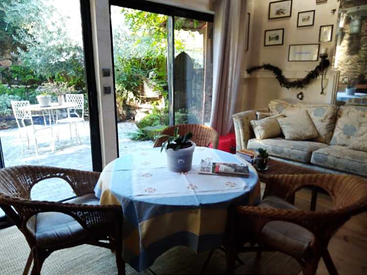 La maison d’amis s’ouvre sur un espace dans lequel il est possible de prendre un thé ou une collation. On accède aussi au garage.