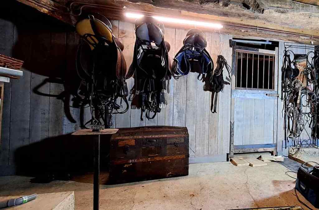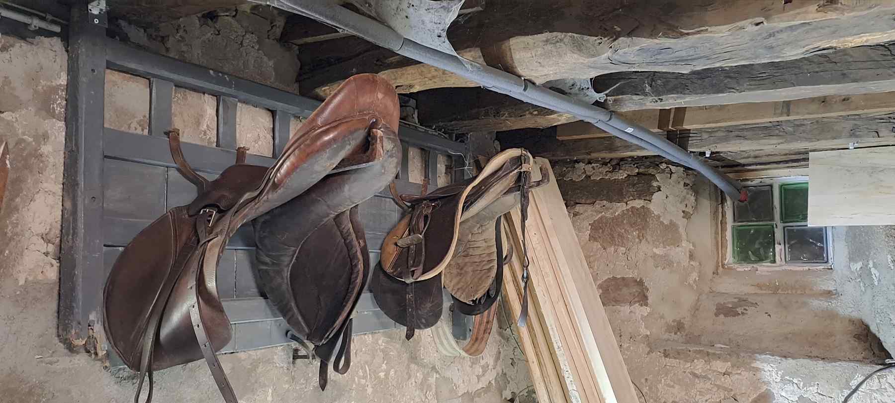 Sur votre gauche, la sellerie offre un espace unique pour le matériel dont vous aurez besoin. Celle-ci donne sur une petite cave.